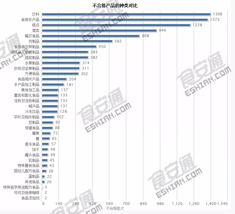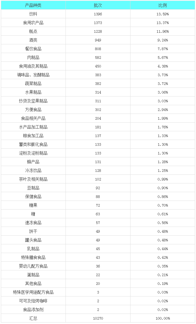 2017年食品抽检不合格信息分析报告,汇总国内不合格食品及其相关产品信息共10257批次样品,涵盖31大类食品,食品添加剂,食用农产品,餐饮食品和食品相关产品。其中饮料1396批次,占总不合格批次的13.59%;食用农产品1373批次,占总不合格批次的13.37%;糕点1228批次,占总不合格批次的11.96%;酒类949批次,占总不合格批次的9.24%;餐饮食品808批次,占总不合格批次的7.87%;肉制品582批次,占总不合格批次的5.67%;其他食品种类统计详见表1。