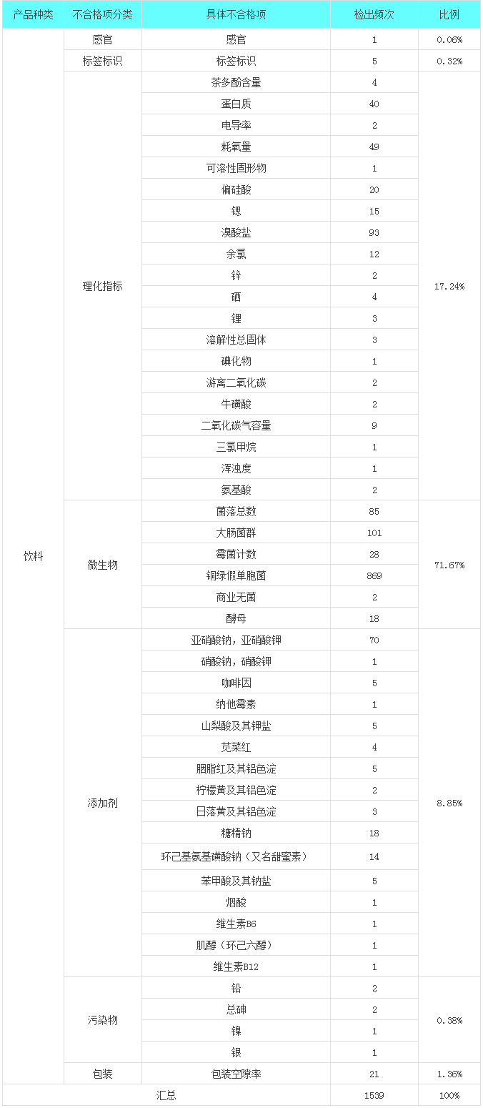 (一)饮料:具体不合格项被检出频次总计1539次 ,其中: