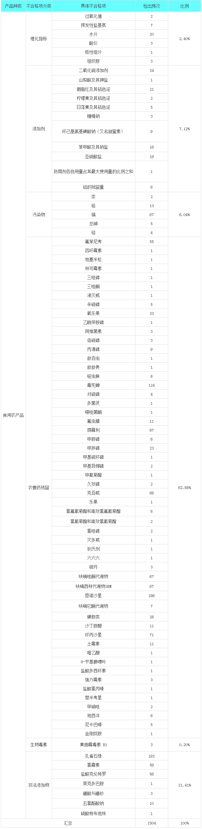 (二)食用农产品:其具体不合格项被检出频次总计1504次 ,其中: