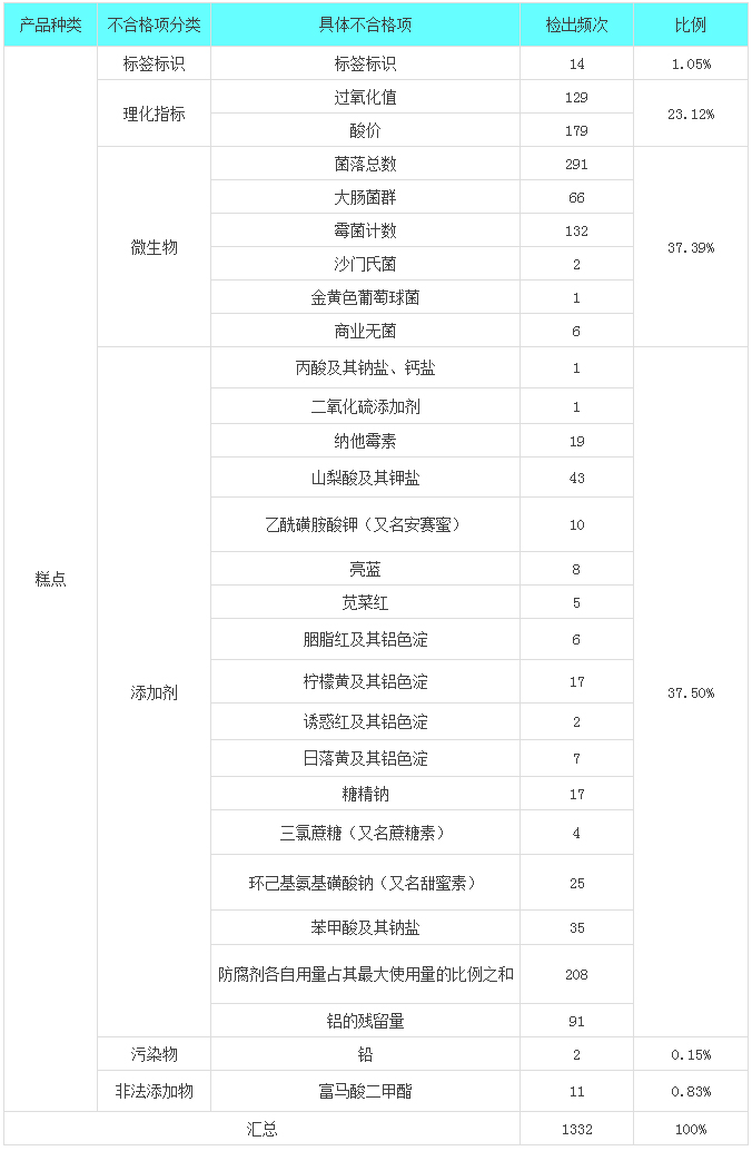 (三)糕点:糕点产品具体不合格项被检出频次总计1332次,其中: