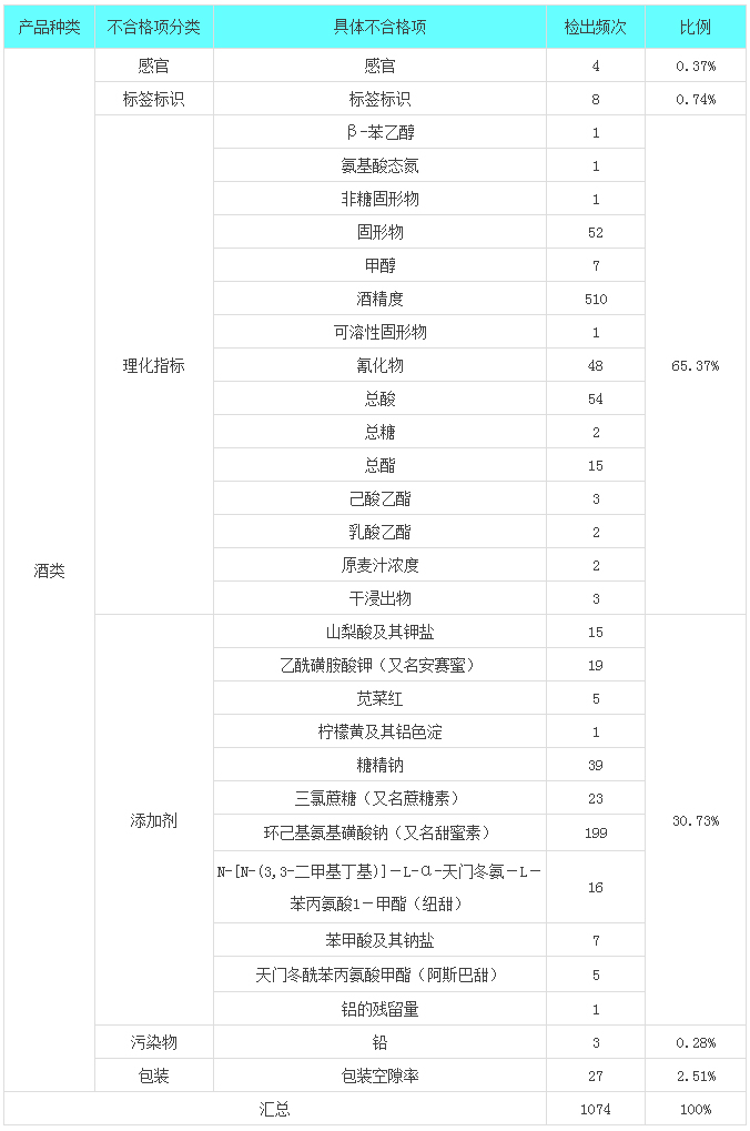 (四)酒类:2017年其具体不合格项被检出频次总计1074次,其中: