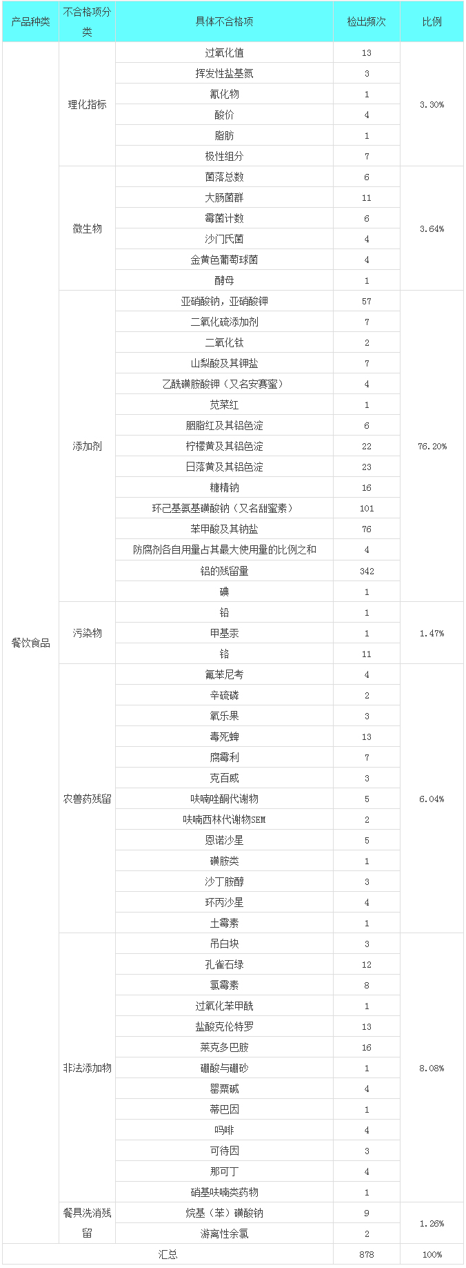 (五)餐饮食品:2017年其具体不合格项被检出频次总计878次,其中: