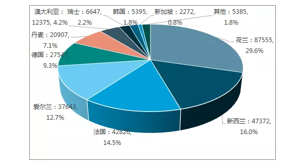 2017年中国婴幼儿配方奶粉进口来源国及比重(来源:中国产业信息)