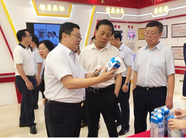 董事长黄嘉棣(左)为武维华副委员长(中)讲解皇氏鲜奶的相关优势和特点