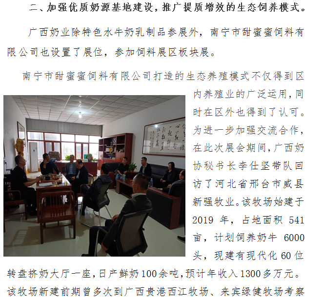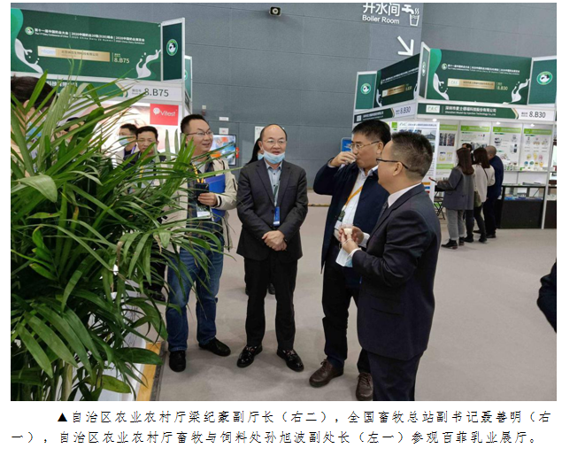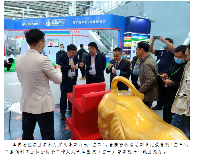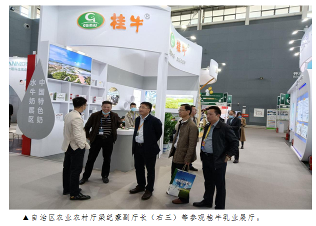 广西水牛奶乳制产品参加了两届中国奶业展览会,得到了消费者和中国奶业协会的好评,这次广西水牛奶乳制产品非常荣幸被大会点名征用。今年参展的企业有:皇氏集团股份有限公司、广西百菲乳有限公司、广西桂牛水牛乳业股份有限公司、广西壮牛水牛乳业有限责任公司等4家水牛奶乳品生产企业,共展出50多个特色奶优质产品。展览期间全国畜牧总站副书记聂善明,中国饲料工业协会协会工作处处长闫奎友,在广西农业农村厅梁纪豪副厅长、畜牧处孙旭波副处长陪同下亲临展区参观,梁纪豪副厅长对广西展区布置和展品展示给于充分的肯定。此次特色奶展览有效地宣传了广西水牛奶产品,让广大消费者对优质高品位的水牛奶特色乳制品有了一个全新的认识。